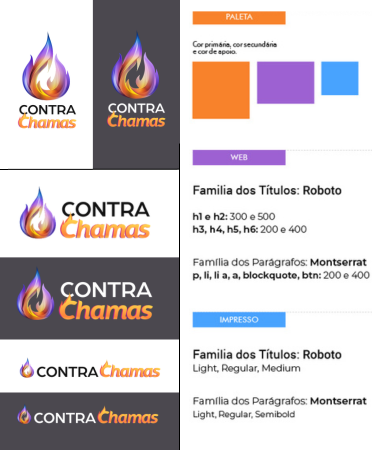 Inspirado no movimento do fogo e na letra “C” de Contra Chamas, exploramos as cores do fogo em uma escala de cores do Azul ao Laranja, dando ênfase às cores Rosa e Roxo, com o objetivo de comunicar melhor com o público feminino.