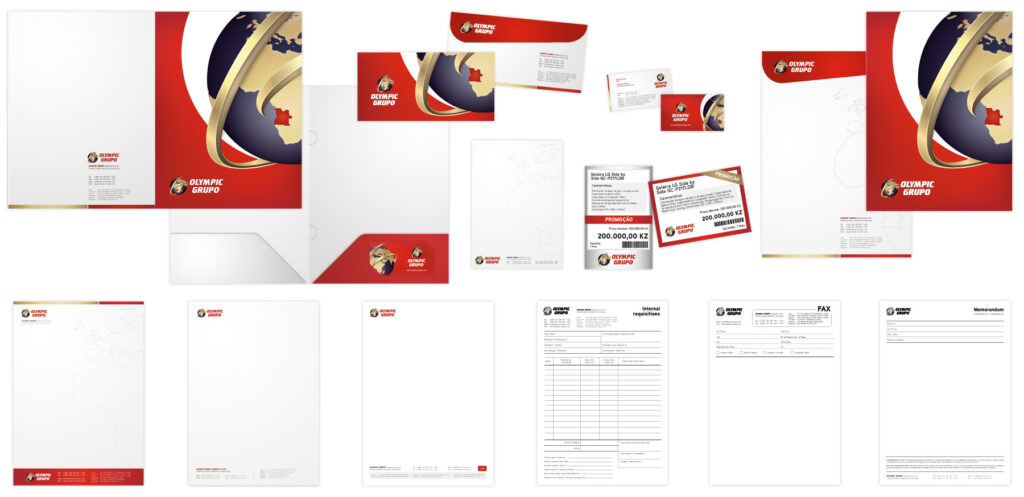 Branding das empresas da Holding Olympic Grupo, incluindo papelaria e peças promocionais.